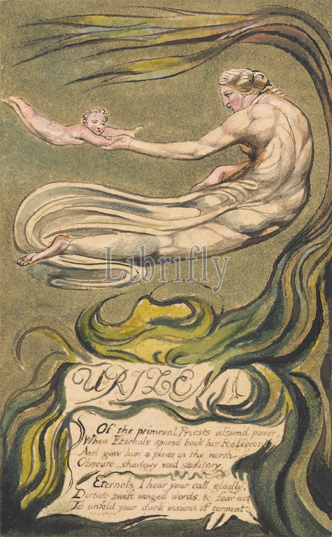 The First Book of Urizen, Plate 2(b), 'Preludium' (Bentley 2b), Print made by William Blake, 1757–1827, British, 1794, Color-printed relief etching in pale brown with pen and black ink and watercolor on moderately thick, slightly textured, cream wove paper, Sheet: 11 7/8 x 9 5/8 inches (30.2 x 24.4 cm) and Plate: 6 1/2 x 4 1/8 inches (16.5 x 10.5 cm), baby, branches, children, flames, gown, infant, literary theme, text, trees, women