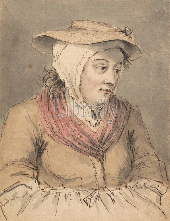 A Fisherwoman, Hands under Apron, Louis Philippe Boitard, active 1734–1760, undated, Pen and black ink, and watercolor on medium, slightly textured, beige laid paper mounted to medium, slightly textured, cream laid paper, Sheet: 6 1/2 × 5 inches (16.5 × 12.7 cm), apron, figure study, fisherwoman, gazing, hat, woman