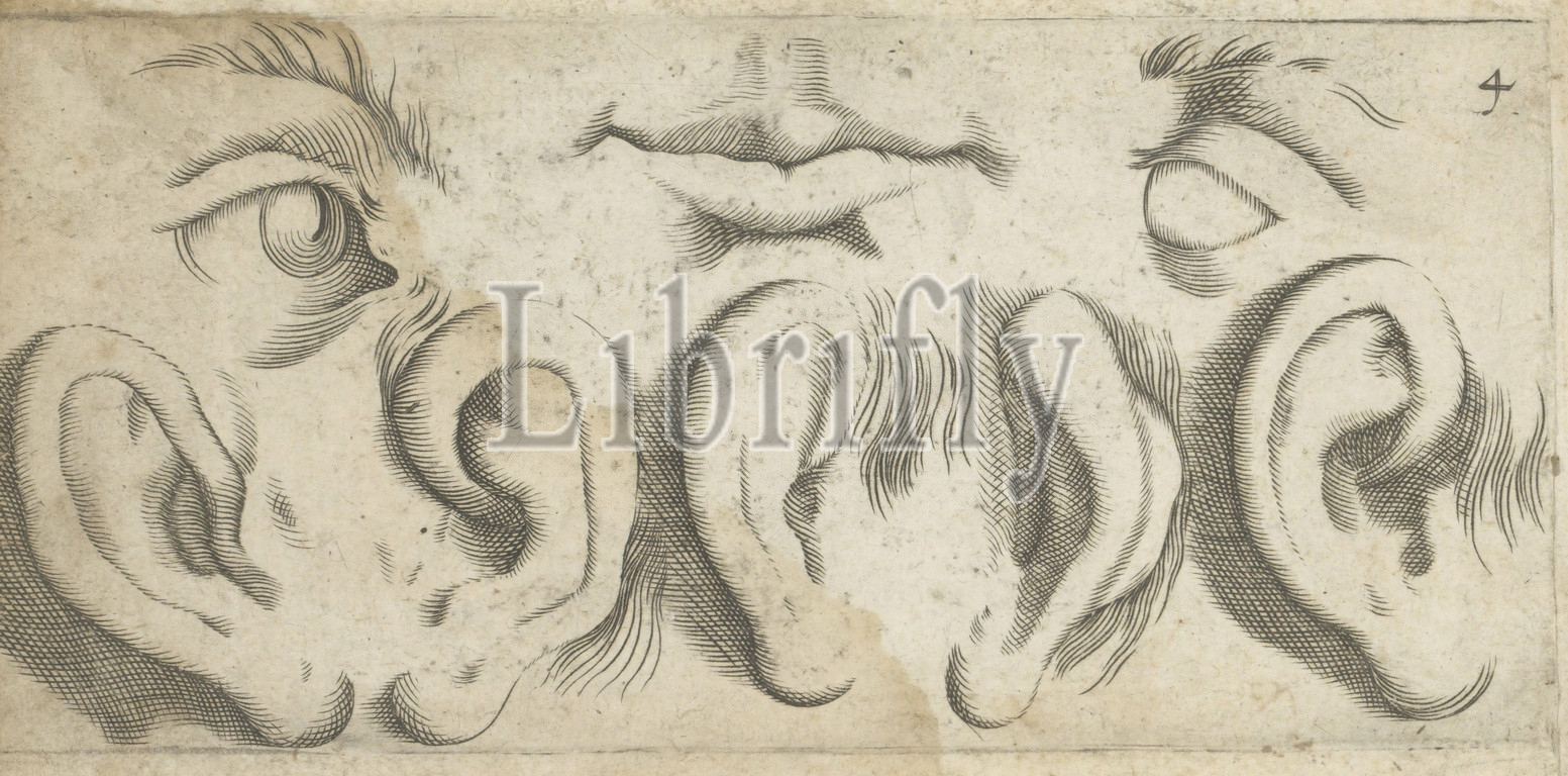 Five ears, two eyes, mouth, Numbered top right, 4, print, part, album, parts, face, lips, eyes, ears, 1576, 1650, paper, engraving