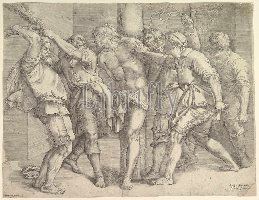 Flagellation, ca, 1552–61, Etching, engraving, sheet, 16 7/16 x 21 9/16, 41.8 54.7 cm, trimmed, platemark, Prints, Battista Franco, Italian, Venice ca., 1510–1561, Venice, After Titian, Tiziano Vecellio, Pieve di Cadore, 1485/90?–1576