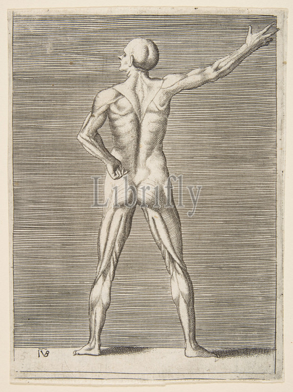 Flayed man seen from the back, his right arm extended, ca. 1531–76, Engraving, sheet: 6 1/4 x 4 1/2 in. (15.8 x 11.4 cm), Prints, Giulio Bonasone (Italian, active Rome and Bologna, 1531–after 1576)