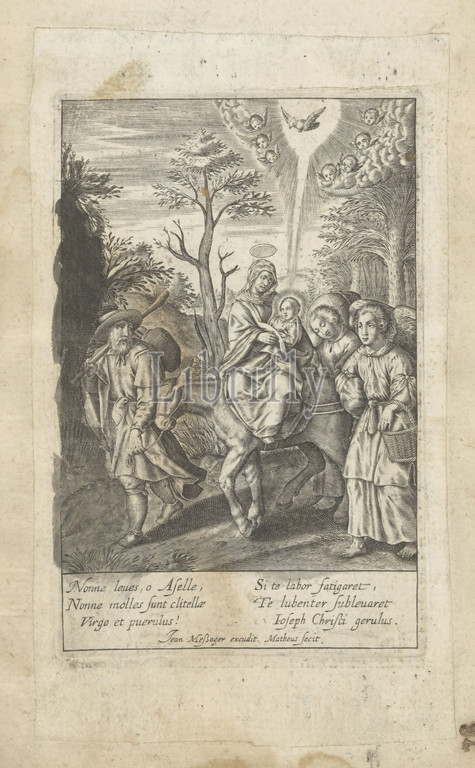Flight, Egypt Vita Deiparae Virginis Mariae, series title, Life, Virgin Mary, Mary rides, Christ child, arms, donkey, Joseph leads, animal, reins, accompanied, two angels, carry, luggage, sky, dove, Holy Spirit, surrounded, cherubim, margin, six-line caption, two columns, Latin, print, part, album, flight, Egypt, Mary, Joseph, child, sometimes, way, Mary usually riding, ass, angel, s, Holy Ghost represented, flames, Jean Matheus, mentioned, object, Paris, 1590, 1649, paper, engraving
