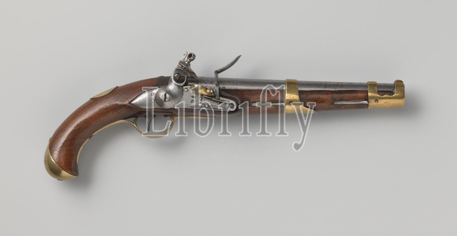 Flint cavalry gun State army, Cavalry gun, State army, National Rifle Factory, Culemborg, lock plate, stamped, Culemborg coat, arms, undecipherable mark, letters DM, DM, repeated, inside, barrel, top, brand, cannot, home, bottom, HI, IH, flask, crooked grip, no carved decoration, AG, brass fitting consists, two sliding loops, front, visor grain, British country model brace-shaped screw plate, butt cap, oval thumb plate engraved, B3, no provision, loading stick, Koninklijke Geweerfabriek Culemborg, 1780, 1790, brass, alloy, wood, plant material, iron, metal, engraving, l 42 9