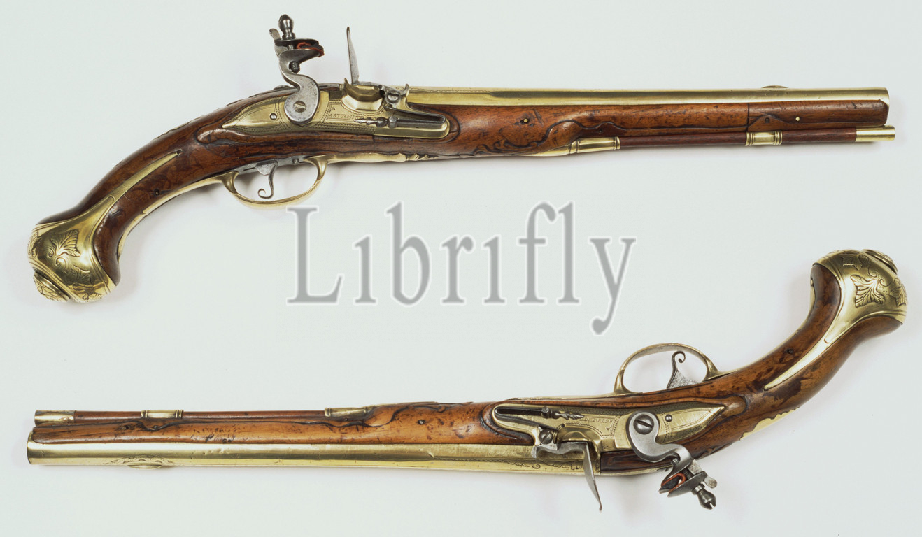 Flint gun with battery lock, Gun belongs to torque. Loop: Steel loop, which is covered with a brass mantle. The front, round, part of the barrel, merges with the room into a five-sided section. Brass oblong grain. Over the entire length of the barrel there is a band that widens towards the rear. On the left side of the room an embossed mark (G). Engraved line and geometric motifs around the visor grain, on the strap at the top of the barrel, on the chamber and the tailpiece. Lock: Battery lock: The flat lock plate made of brass is flattened at the top and bottom. The pan is made of brass and has facets. The rooster is flattened on the outside. The top of the pawn cover and the front of the stop face have facets. On the lock plate engraved with line and saw-tooth motifs the signature: A. STREIGNARD. The lock is attached with two bolts. Wood: Walnut: carved at the rear loading stick carrier and behind the tail piece with stylized leaf motifs. Fittings: Brass: flat, one-piece, counter-lock plate, engraved with geometric motifs and stylized leafwork, loading stick carriers with narrow profile edges and facets, thumb plate in the shape of an inverted pear-shaped cartouche, engraved with stylized leafwork and above which a crown-shaped leaf motif, flat trigger guard, the sides of which are obliquely flattened and end in front in a stylized sheet metal, butt button in the form of a monster head., A. Streignard, West-Europa, c. 1770 - c. 1780, lade, kolf, haan, vuurstaal, kolfkap, trekkerbeugel, beslag, engraving, l 49 cm l 32 cm d 15 mm