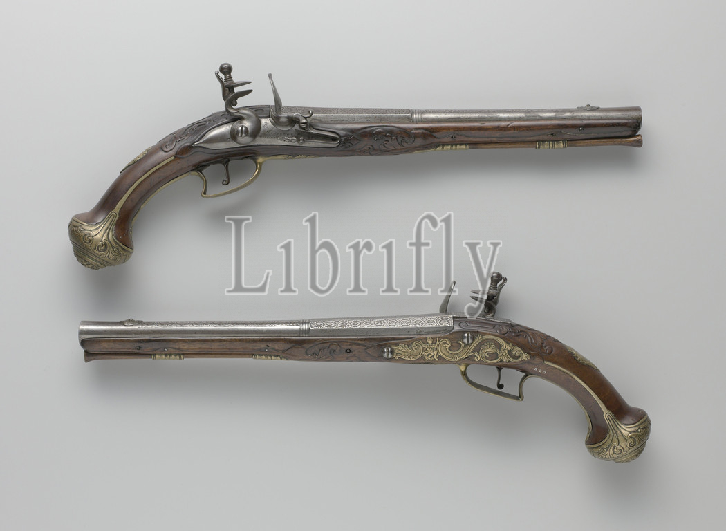Flint gun, Part, couple, lock, undecorated except, signature, brand, barrel, etched, top, embossed arabesques, provided, inscription, stamped, back left, arms, Utrecht, visor grain, black-and-white relief decoration, form, grotesque mask, flask, cut, things, accolade, batter, brass, formerly gilded, embellished ornaments, granular surface, excluding, two loading rod tubes, consists, ranks, screw plate, side, human figure, runs, dragon's head, angular trigger guard, acanthus decoration, thumb plate framed, foliage, mask, bottom, round cap decorated, acanthus vines, lion's head, central butt cap, loading stick, gold-plated, brass cap, Westerhof, 1720, 1740, wood, plant material, alloy, gilding, material, black-and-white, metal, engraving, l 48 5