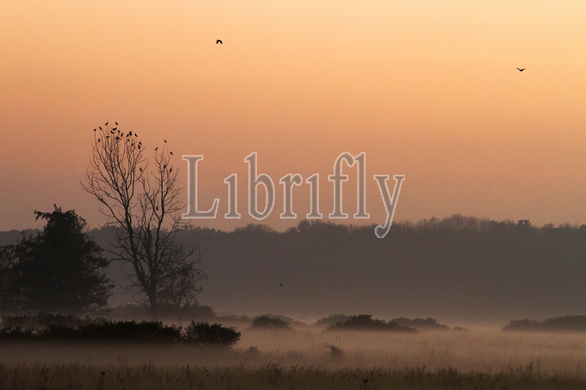 Flock of birds perched in tree in misty landscape of Lentevreugd, Netherlands