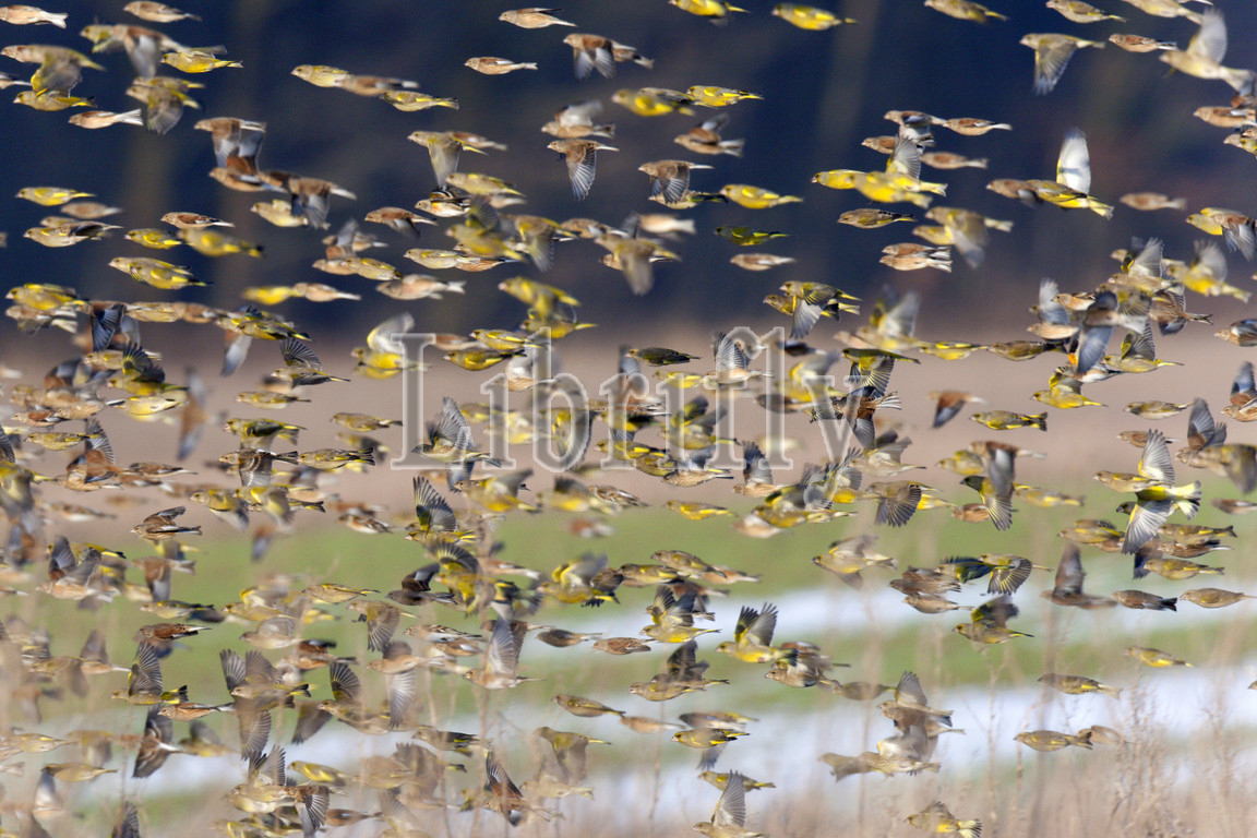 Flock, wintering, seedeating songbirds, Linnet, Greenfinch, flying, wintery, arable land, Mortelshof, Netherlands, nature, bird, animal, wildlife, wild, fauna, natural, feather, sky, beak, wing, outdoor, freedom, colourful, Liszt, Natural History, ornithology, vertebrate animals, photography, color image