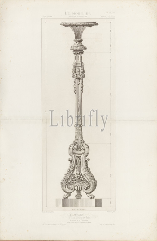 Floor lamp carved and gilded. Crown Furnishings, Floor lamp from the 18th century (Louis XVI style), Signed: Rod., Pfnor del, Sellier sc, Ch. Juliot, Editeur; Ch. Et al. Chardon, Pl. 39-40, p. 8, Pfnor, Rodolphe (del.); Sellier (sc.); Juliot, Ch. (ed.); Chardon, Ch. et A. (imp.), Rodolphe Pfnor: Le mobilier de la couronne et des grandes collections publiques et particulières du XIIIe siècle au XIXe siècle: mobilier civil. Mobilier religieux. Meubles, tentures, tapisseries, bronzes et objets d'art de toutes les époques accompagnés de dessins, grandeur d'exécution. Paris: Ch. Juliot, Editeur: Librairie Générale de L'Architecture et des Travaux Publics, 1874-1876