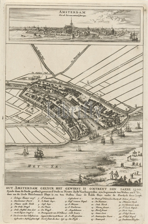 Floor plan of Amsterdam with cityscape, 1300 Out of Amsterdam it was around 1300 / Amsterdam Zoo as it was around Jaer 1300 (title on object), Above a view on Amsterdam, below a map in a bird's eye view. Both represent the city as it would have looked around 1300. Under the title and the legend 1-35, maps of cities, prospect of city, town panorama, silhouette of city, Amsterdam, Jan Luyken (attributed to), 1693 - 1694, paper, engraving, h 286 mm × w 185 mm