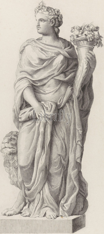 Flora, Johannes van der Kellen, 1862, Statue, Flora, garland, flowers, head, left hand, horn, flowers, grapes, Flora, pedestal, lion looking up, image, print, unknown, print maker, Johannes van der Kellen, 1862, paper, engraving, h 406 mm × w 270 mm