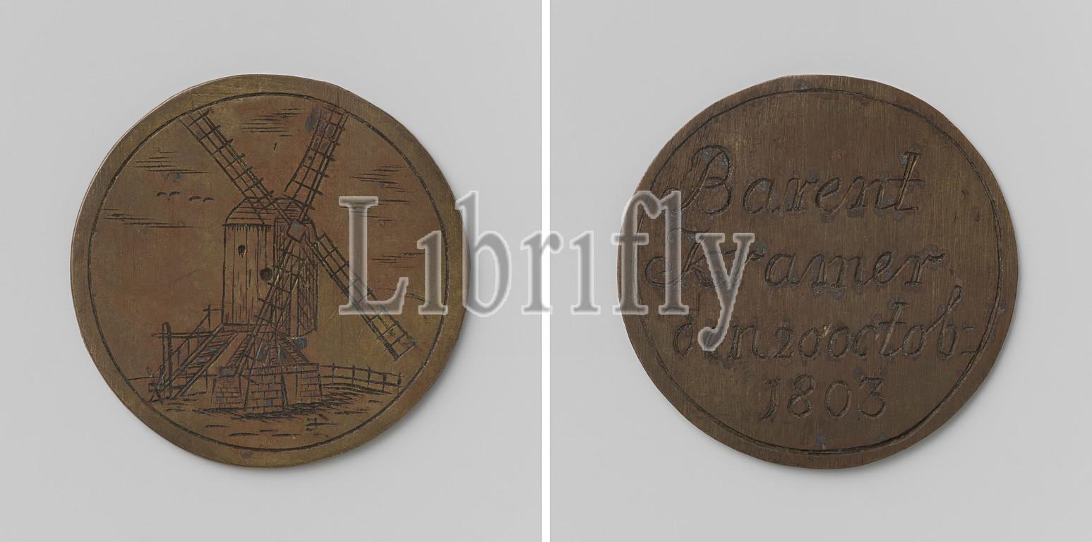 Flour Miller's Guild of Amsterdam, Guild Medal of Barent Kramer, Brass Medal. Front: flour mill. Reverse: inscription, Barent Kramer, anonymous, Amsterdam, 1803, brass (alloy), engraving, d 4 cm × w 8.36 gr