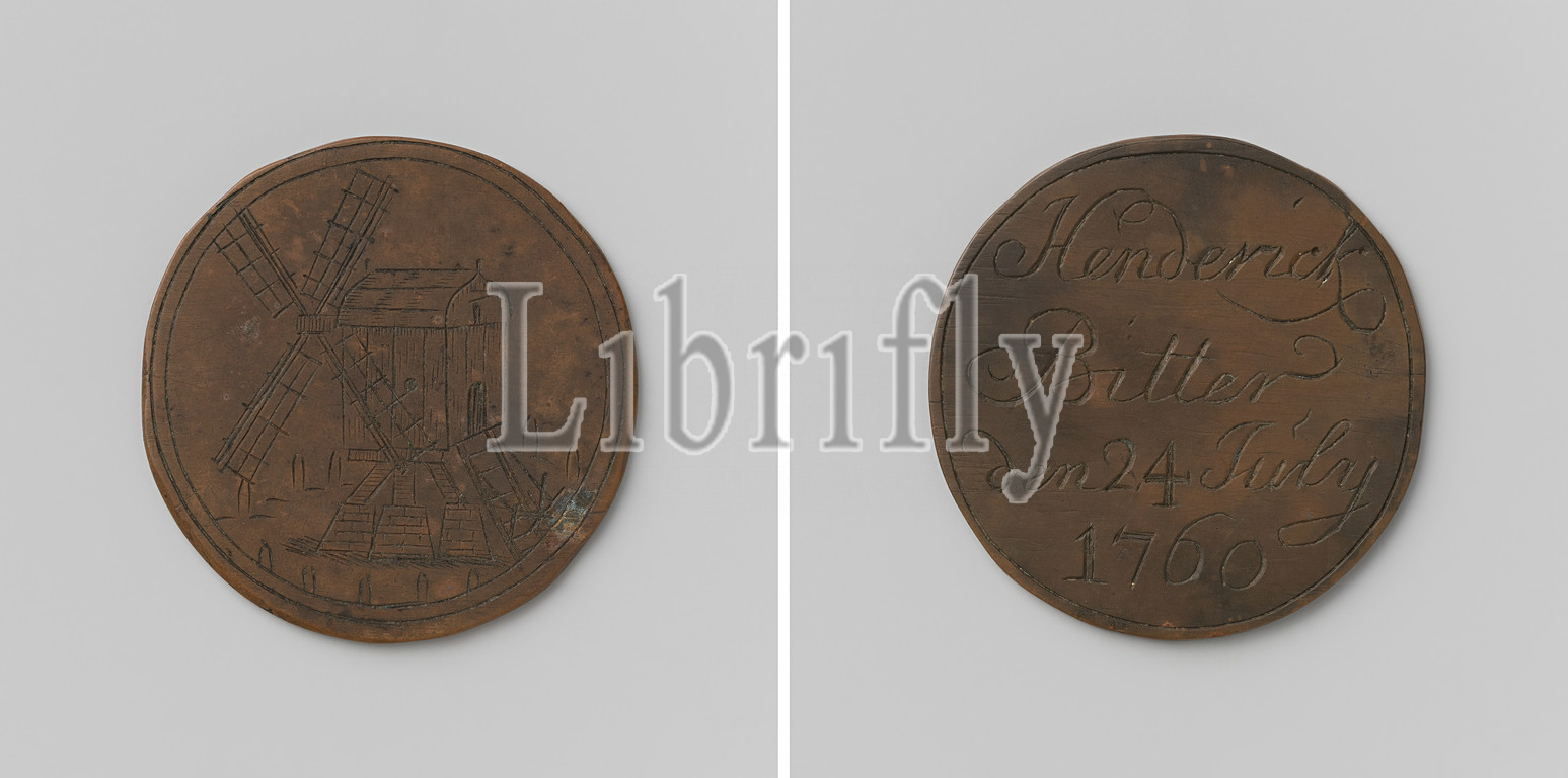 Flour Miller's Guild of Amsterdam, Guild Medal of Henderick Bitter, Copper Medal. Front: flour mill. Reverse: inscription, Amsterdam, Henderick Bitter, anonymous, 1760, copper (metal), engraving, d 3.5 cm × w 11.48 gr