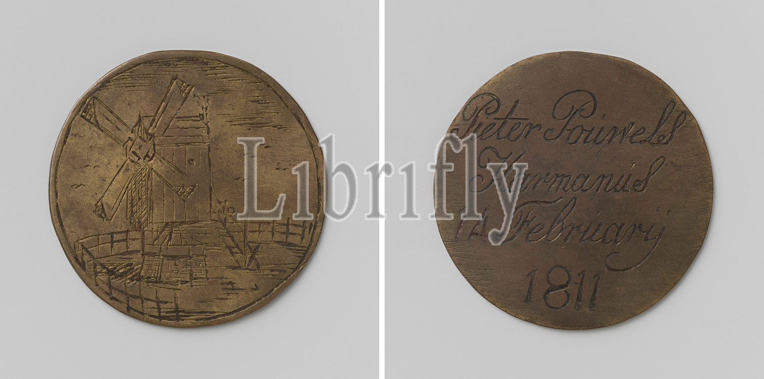 Flour Miller's Guild of Amsterdam, Guild Medal of Pieter Pouwels Harmanus, Brass Medal. Front: flour mill inside fence. Reverse: inscription, Amsterdam, Pieter Pouwels Harmanus, anonymous, 1811, brass (alloy), engraving, d 4 cm × w 9.13 gr