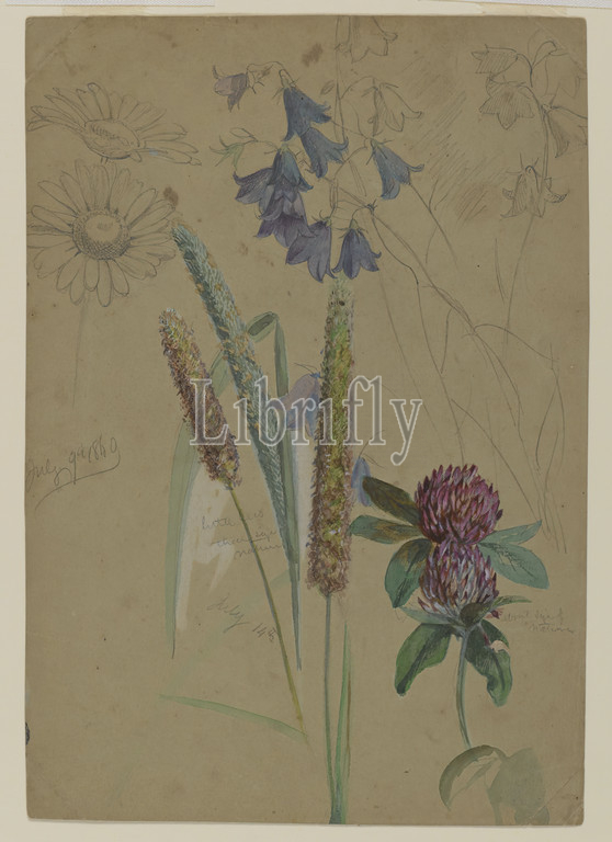Flower Study, William Trost Richards, American, 1833-1905, Opaque watercolor, graphite, moderately thick, slightly textured brown wove paper, July 9-14, 1860, Sheet, 8 1/8 x 5 5/8, 20.6 x 14.3 cm, American, botanical, botany, cattail, drawing, fine lines, flowers, thistle, typha, watercolor