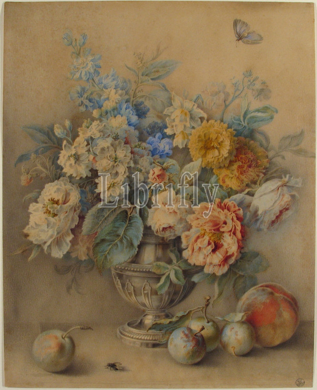 Flowers in a Silver Caster, Fruit in the Foreground, 18th century, Watercolor, over traces of graphite, 13 5/8 x 10 7/8 in. (34.6 x 27.6 cm), Drawings, Jacques André Portail (French, Brest 1695–1759 Versailles)