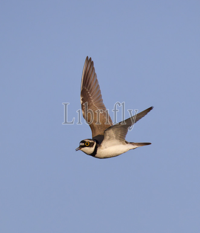 Flying, displaying male Little Ringed Plover in blue sky, Charadrius dubius, Netherlands