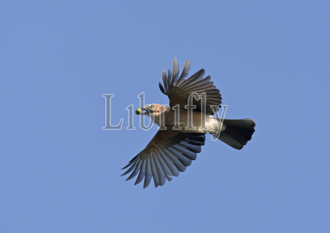 Flying Eurasian Jay with acorn in its bill, Garrulus glandarius, Netherlands