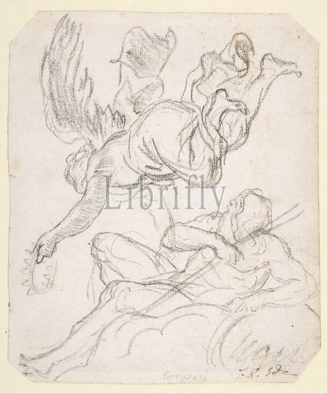 Flying Figure Holding, Crown, Reclining River God, n.d, Black chalk, 6 7/16 x 5 1/2, 16.3 14 cm, Drawings, Jacques Louis David, French, Paris, 1748–1825, Brussels, student, French Academy, David filled sketchbooks, drawings, antique, well, Baroque art, sketch, figures, Pietro da, Cortona, fresco, Assumption, Virgin, apse, Church, Santa Maria, Vallicella, Rome
