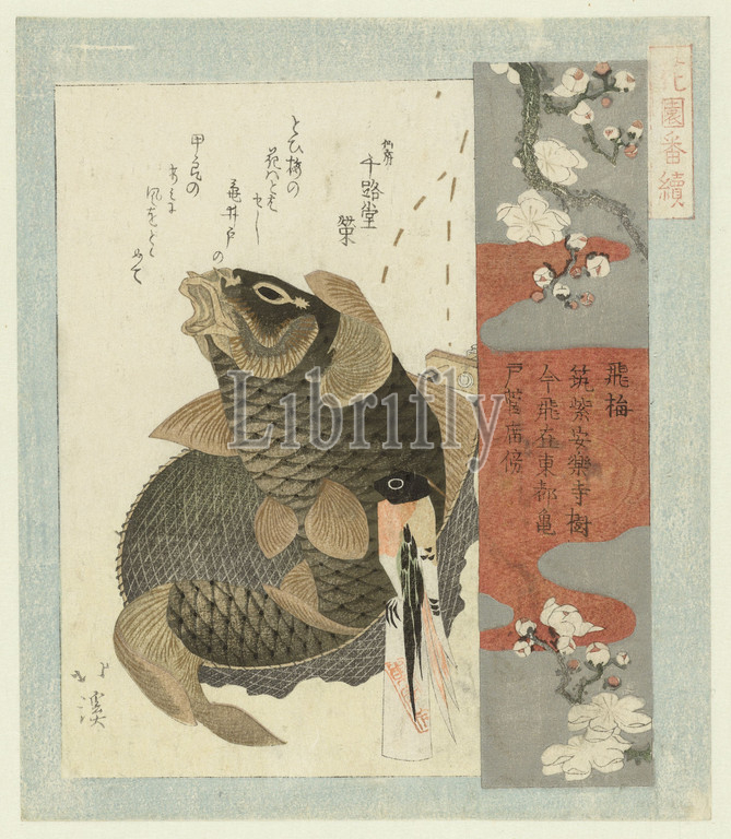 Flying plum Tobiume, title, object, series, Hanazono poetry association, series title, Hanazono bantsuzuki, carp, fishing net, wooden statue, bird, Next, plum blossom, black-and-white-red background, print refers, plum tree, garden, Sugawara no Michizane, 845-903, cared, well, tree, followed, Michizane, banished, poem, bony fishes, Totoya Hokkei, mentioned, Japan, 1820, 1825, paper, colour woodcut