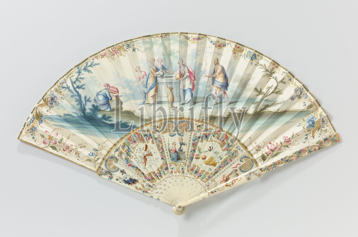 Folding fan with leaf on which in watercolor Eliezer, Rebecca at the source, on a frame of carved and painted ivory with mother-of-pearl, On the leaf is an episode from the much loved Bible story about bridal recruitment and marriage van Isaac, which was frequently depicted on fan blades. The most commonly used - similarly here - was the moment when Eliezer handed over the jewelry and thus made the actual proposal (Gen. 24:22). This is not surprising, since many of these fans were intended as a wedding gift. Eliezer was sent by Abraham to the city of Nahor to find a bride for his son Isaac. Once at the well outside of this city, Eliezer met Rebecca who gave him and his camels to drink and thereby became the God-appointed bride for Isaac. Then Eliezer gave her a nose ring and two bracelets of gold (Gen. 24: 11-23). It is striking that the depiction of the Bible text differs: Rebecca does not get a nose ring but a necklace and the camels are missing. Rebecca and three women draw water from the well on the parchment leaf. To the left, Eliezer's servant is kneeling in the bushes by an open chest, to the right, Eliezer is approaching Rebecca, holding a chain in his outstretched hands. A frame of bushes and trees. The performance is framed by a border of flowers and leaves. Backside of the leaf: two flower sprays in the center of an empty leaf, along three edges a simple border of flowers. The frame has three cartouches, the middle one a love pair with flowers, the left wooden wind instrument with sheet music, the right grape bunch, peaches and a bird. The cartouches are surrounded by an open cut edge with flowers and fruits and topped by a fruit basket with butterflies. Four rocaille ornaments, cut open, with mother-of-pearl behind it. The support part of the closing legs is cut open and has a mother-of-pearl back. The hand part of the closing legs is partially cut open and painted further. Straight shoulder. Copper locking pin with a mother-of-pearl disc underneath. 22