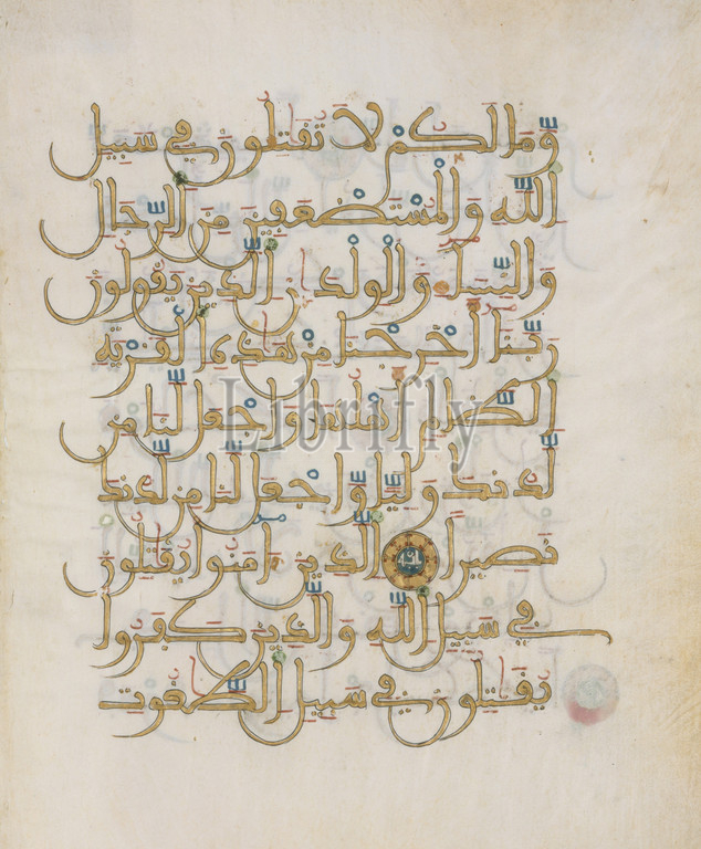 Folio, Qur, Manuscript, ca, 1250–1300, North Africa, Ink, opaque watercolor, gold, parchment, Page, H, 10 1/4, 8 9/16 cm, Codices, Qur'ans, Maghreb, Islamic west, Spain, diverged, early date, stream, developments further east, preservation, number, archaic calligraphic, features, derived, kufic, typical, region, thirteenth, fourteenth centuries