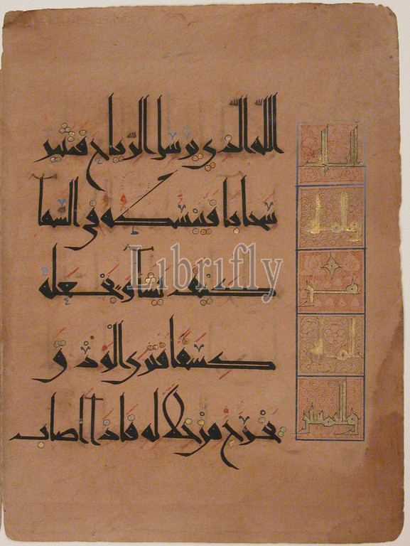 Folio, Qur, Manuscript, dated .H, 485/.D, 1092, Attributed, Iran, Afghanistan, Ink, opaque watercolor, gold, paper, 10 1/2 x 7 7/8, 26.7 20 cm, Codices, page, almost, certainly, comes, dispersed Qur, 485, .D, new style, script, mainly, eastern Islamic, lands, paper replaced, parchment, writing material, tenth century