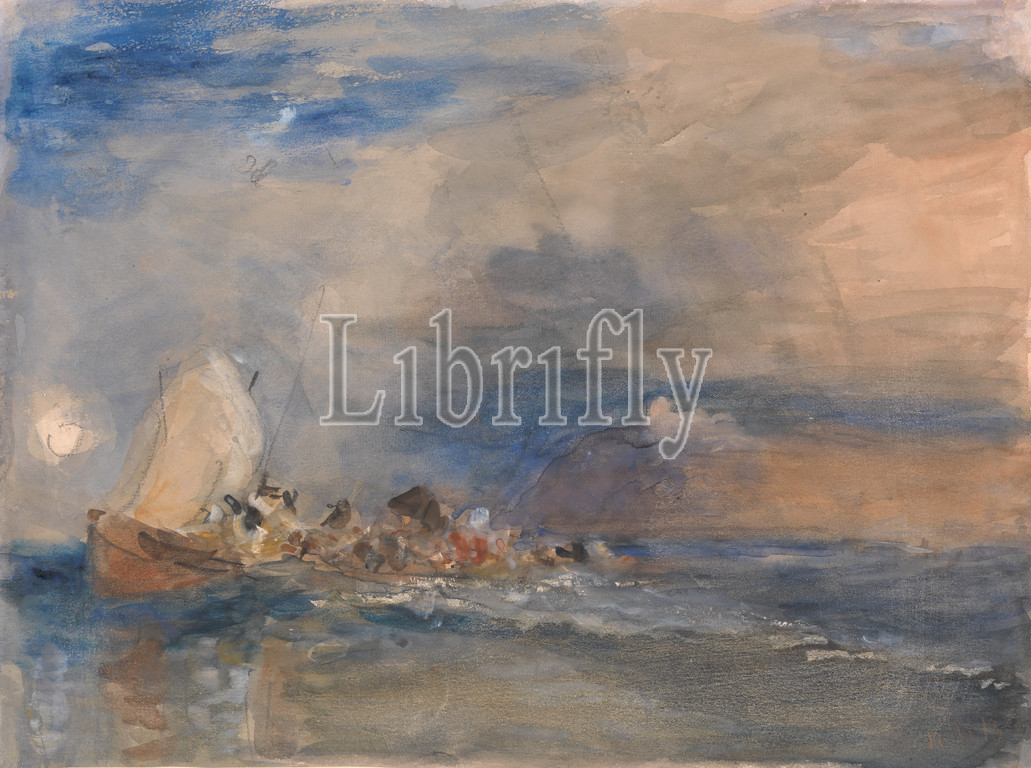 Folkestone, Hercules Brabazon Brabazon, 1821–1906, British, after Joseph Mallord William Turner, 1775–1851, British, undated, Watercolor and graphite on moderately thick, slightly textured, cream wove paper mounted on moderately thick, slightly textured, cream wove paper, Mount: 9 1/2 × 12 3/8 inches (24.2 × 31.4 cm) and Sheet: 8 5/8 × 11 5/8 inches (21.9 × 29.5 cm), clouds, marine art, men, sailboat, sea, seamen, England, Europe, Folkestone, Kent, United Kingdom