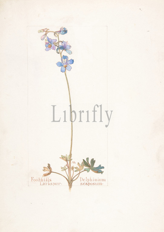 Foothills Larkspur, Delphinium scaposum, May 13, 1912, Watercolor and brown ink over graphite, with page design indicated in graphite, sheet: 13 11/16 x 9 15/16 in. (34.8 x 25.2 cm), Drawings, Margaret Neilson Armstrong (American, New York 1867–1944 New York)