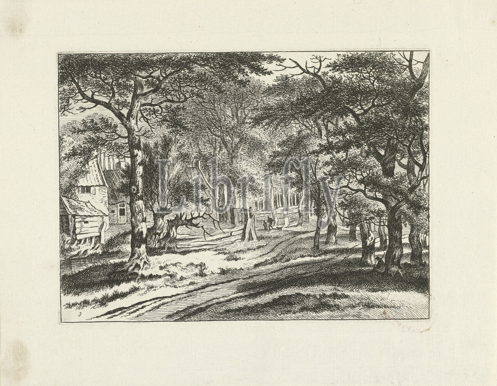 Forest landscape, houses Landscapes, series title, houses, two walkers, dog, middle, right foreground, figure leaning, tree, Third print, series, six, landscapes, Forest, wood, landscape, figures, staffage, Johannes Gronsveld, 1679, 1728, paper, engraving