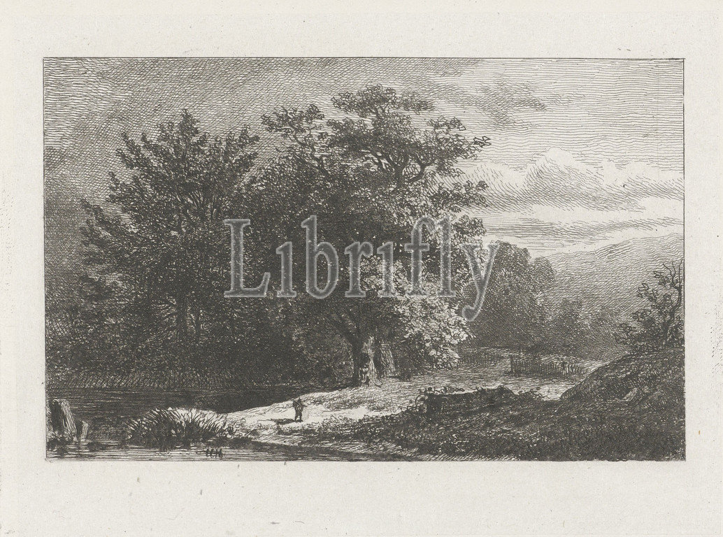 Forest landscape, lake, Wooded landscape, small lake, left, figure, middle, Forest, wood, landscape, figures, staffage, Constantinus Cornelis Huysmans, mentioned, object, 1820, 1886, paper, engraving