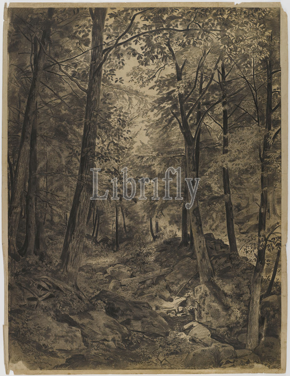 Forest Scene, Rocky Brook, William Trost Richards, American, 1833-1905, Charcoal, cream, moderately thick, slightly textured wove paper mounted, paper., ca. 1864-67, Sheet, drawing, 22 13/16 x 17 13/16, 57.9 x 45.2 cm, American, drawing, fine lines, forest, leaves, trees