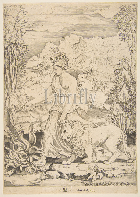 Fortitude in profile view walking toward a fire at left and leading a harnessed lion, a landscape in the background, ca. 1515–27, Engraving, Sheet (Trimmed): 10 1/4 × 7 5/16 in. (26 × 18.5 cm), Prints, Marco Dente (Italian, Ravenna, active by 1515–died 1527 Rome), After Raphael (Raffaello Sanzio or Santi) (Italian, Urbino 1483–1520 Rome), or Tommaso Vincidor (Tommaso di Andrea) (Italian, Bologna ca. 1517–ca. 1536 Breda (?))