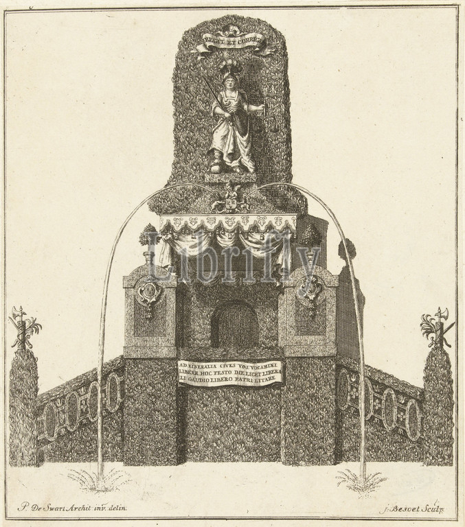 Fountain, front, facade, city hall, entry, Willem IV, consort, Breda, 13 September 1737, Iven Besoet, Pieter de Swart, 1737, Fountain, front, facade, city hall, entry, Willem IV, consort, Breda, 13 September 1737, design, court architect Pieter de Swart features, statue, Justitia, print maker, Iven Besoet, mentioned, object, intermediary draughtsman, Pieter de Swart, Hague, 1737, paper, etching, engraving, h 201 mm × w 170 mm