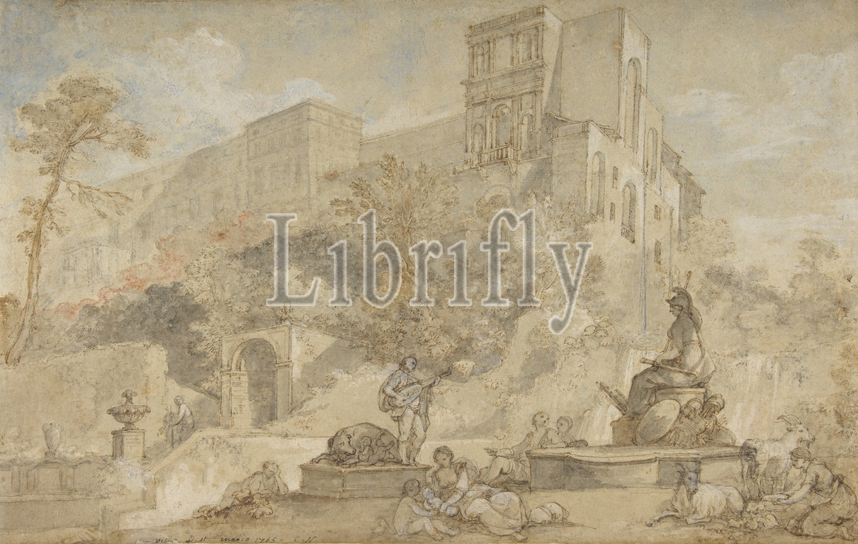 Fountain, Rome, Villa d'Este, Tivoli, 1765, Pen, brown ink, brush, brown, gray wash, watercolor, heightened, white, black, red chalk, faded blue paper, 11 7/8 x 18 3/4, 30.2 47.6 cm, Drawings, Charles Joseph Natoire, French, Nîmes, 1700–1777, Castel Gandolfo