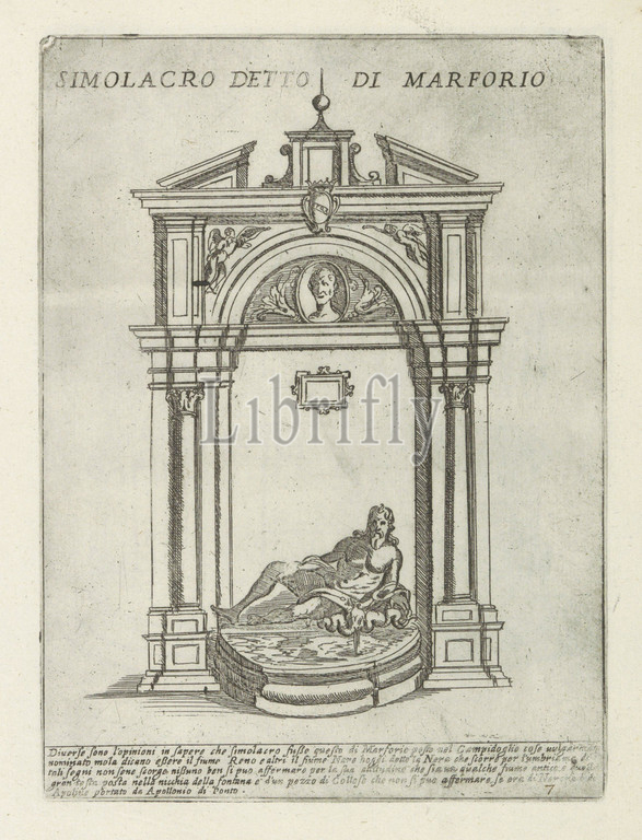 Fountain, statue, Marforio, Simolacro detto di Marforio, Modern, antique monuments, structures, Rome, series title, Ornamenti di fabriche antichi et moderni dell' alma citta di Rom, series title, Sculpture, Marforio, talking statues, Rome, Text, Italian, image, print, part, album, print maker, Giovanni Maggi, intermediary draughtsman, Giovanni Maggi, print maker, Rome, intermediary draughtsman, Rome, publisher, Italy, Vaticaanstad, Italy, Rome, 1576, 1618, 1600, paper, etching, height 215 mm, width 159 mm