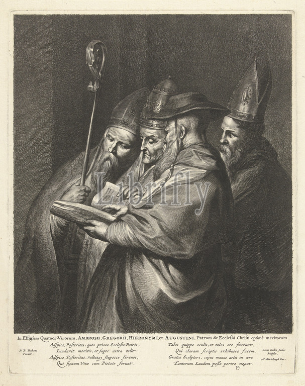 Four Church Fathers: Saints Ambrosius, Gregorius, Hieronymus and Augustine In Effigiem Quatuor-Virorum (.. .) Christi optime meritorum (title on object), Four Fathers of the Church: Saints Ambrosius, Gregory, Hieronymus and Augustine. Under margin Latin verse., Ambrose, bishop or Milan, possible attributes: beehive, cradle with baby, three-knotted scourge, pope Gregory the Great, possible attributes: deaf, emperor Trajan, the monk and hermit Jerome (Hieronymus), possible attributes: book, cardinal's hat, crucifix, hour-glass, lion, skull, stone, Augustine, bishop or Hippo, possible attributes: arrows piercing his breast, book, child with spoon, flaming heart, heart (pierced with arrows), pen, the four Latin (Western) Fathers of the Church together: Ambrose (usually as bishop), Jerome (usually as cardinal ), Augustine (usually as bishop), Gregory the Great (usually as pope), Cornelis van Dalen (II) (mentioned on object), Amsterdam, 1648 - 1664, paper, engraving, h 325 mm × w 257 mm