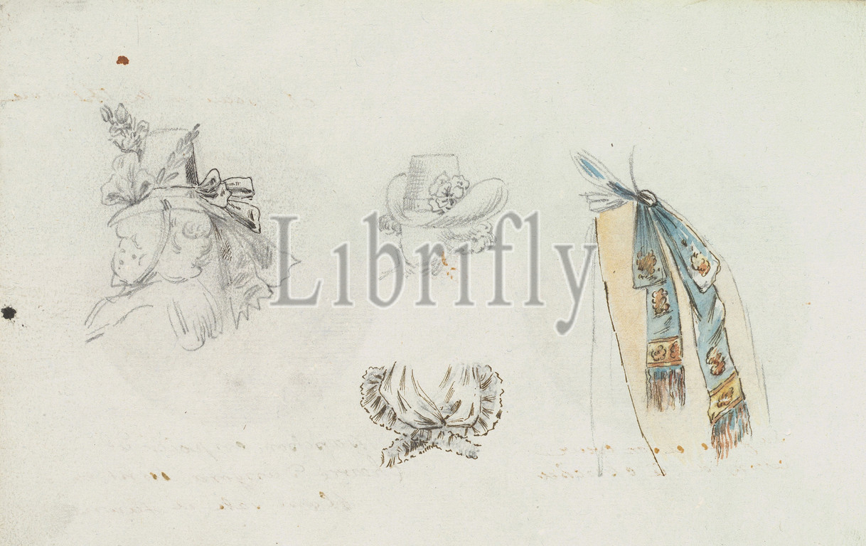 Four Designs of Costume Accessories, ca. 1785–90, Pen and black ink, graphite, gouache, Sheet: 6 11/16 x 9 15/16 in. (17 x 25.3 cm), Anonymous, French, 18th century, Possibly connected to Antoine Caire-Morand (French, Briançon 1747–1825 Turin), Anonymous, French, 19th century, Page with four sketches of costume accessories including two hats, a ruffled fichu, and a bouffant skirt with a sash. The first sketch on the left is a graphite and ink drawing of a woman's face in profile wearing a top hat with a neck strap