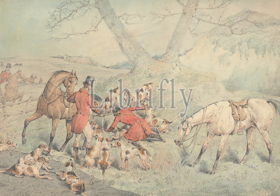 Foxhunting, Gone, Ground, Henry Thomas Alken, 1785–1851, British, Graphite, watercolor, moderately thick, slightly textured, beige, wove paper, Sheet, building, dogs, animals, fence, fox hunting, horseback riders, horseback riding, horses, animals, hounds, dogs, hunt, hunters, hunting, jumping, landscape, men, sporting art, trees, whip