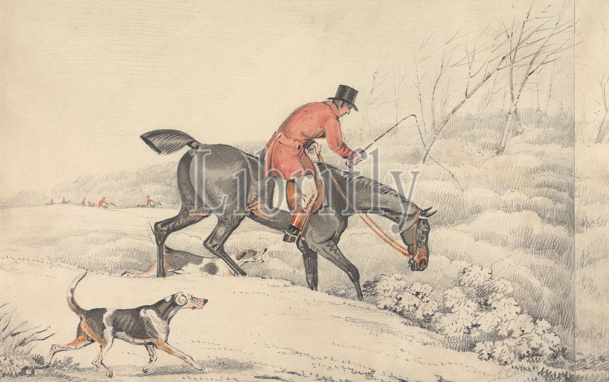 Foxhunting: Rider and a Couple of Hounds Entering a Covert, Samuel Alken, 1756–1815, British, undated, Watercolor, pen and black ink, and graphite on medium, slightly textured, blued white, wove paper, Sheet: 9 7/8 × 15 3/4 inches (25.1 × 40 cm), bushes, dogs (animals), fields, fox hunting, horseback riders, horseback riding, horses (animals), hounds (dogs), hunt, hunters, hunting, landscape, men, sporting art, trees, whip