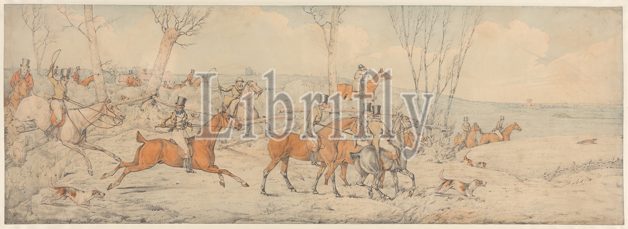 Foxhunting: The Start, Henry Thomas Alken, 1785–1851, British, 1822, Graphite and watercolor on medium, moderately textured, beige, wove paper, Sheet: 9 1/2 × 26 13/16 inches (24.1 × 68.1 cm)