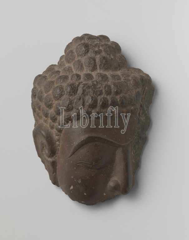 Fragment, Buddha statue, Buddha head, black limestone, right-hand side, face, retained, Dvaravati, 700, 800, limestone
