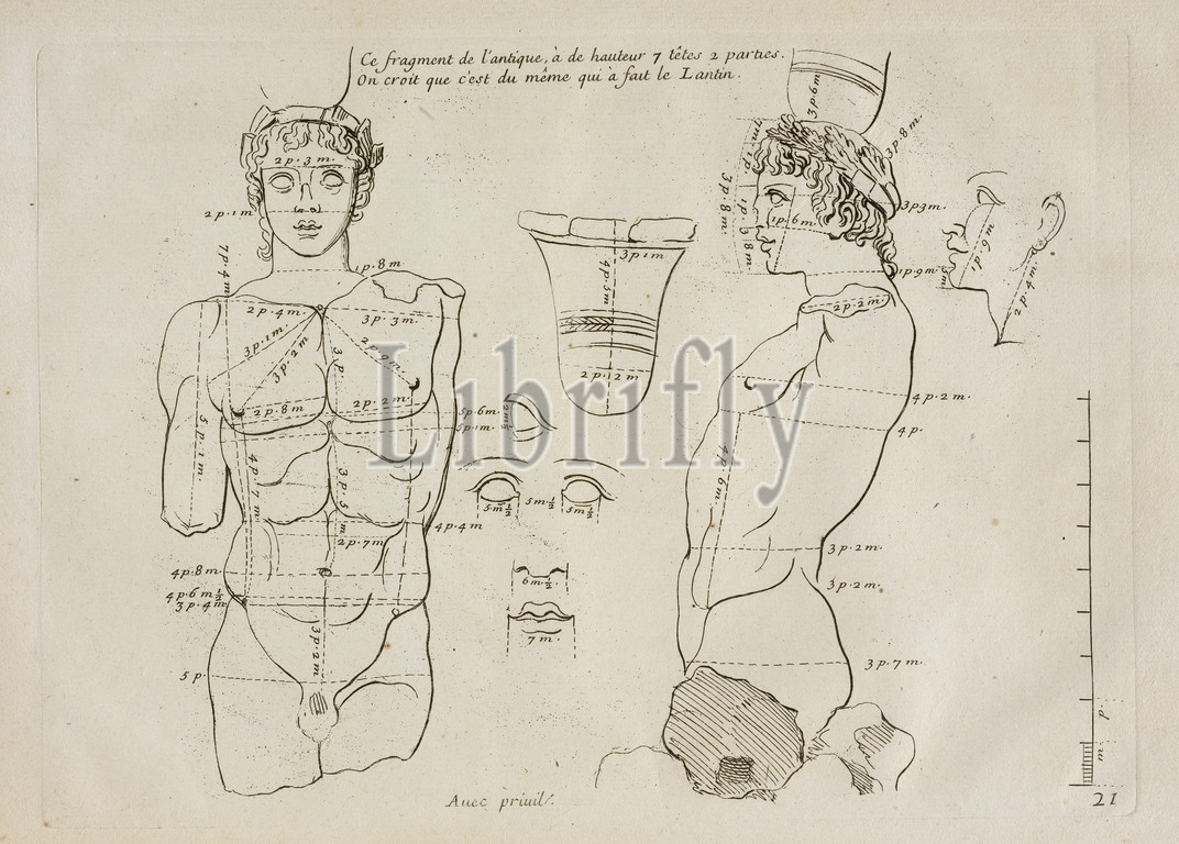 Ce fragment de l'antique. Les proportions du corps humain: mesurées sur les plus belles figures de l'antiquité, Audran, Gérard, 1640-1703, Etching, 1683, Plate 21, sculptural fragments. Plates 1-30 illustrate human proportions measured from antique statues, such as the Laocoon, the Farnese Hercules, and the statue of Pyramus in the Ludovici Collection.