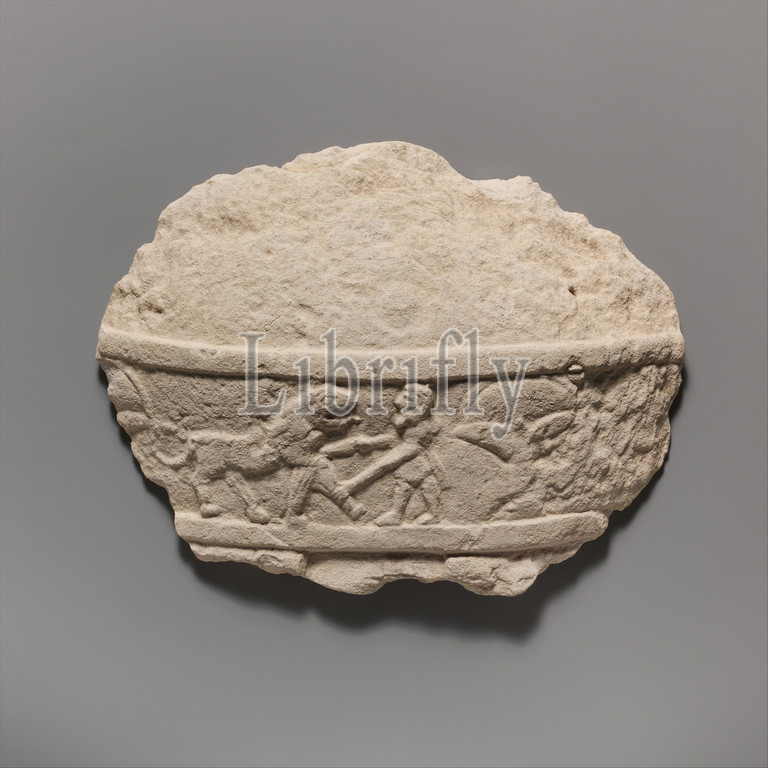 Fragment, limestone statue, male votary, worshipper, Archaic, 1st half, 6th century B.C, Cypriot, Limestone, Overall, 6 5/8 x 7 1/4 1 1/4, 16.8 18.4 3.2 cm, Stone Sculpture, fragment, comes, -life-sized, Preserved, traces, figure, navel, part, belt, decorated, low relief, subject, Herakles, combat, lion, oriental vegetation