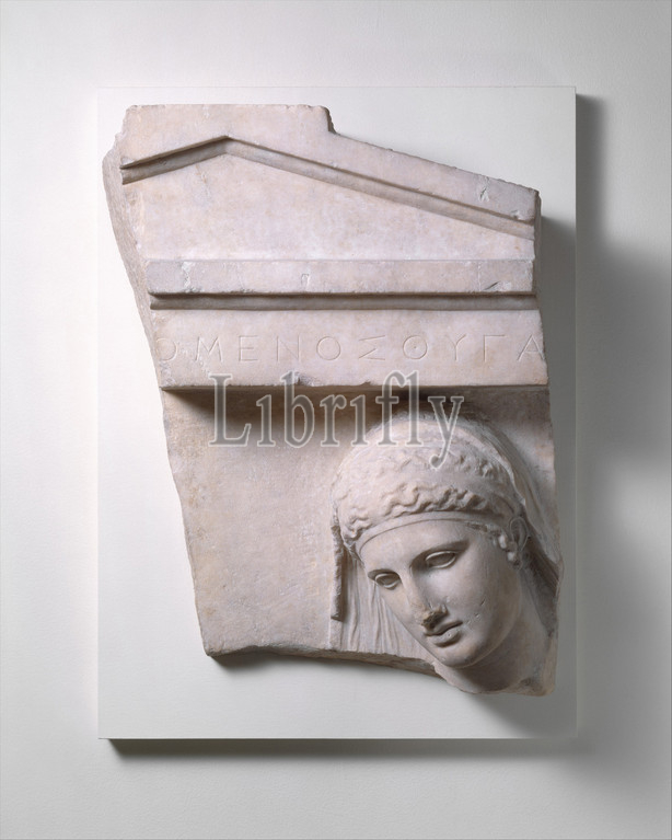 Fragment, marble grave stele, woman, Classical, ca, 400–390 B.C, Greek, Attic, Marble, Pentelic, H, 26 7/8, 68.2 cm, Stone Sculpture, Inscribed, architrave, daughter, omenes', regular features, simplified planes, face impart, quiet dignity, serenity, hallmarks, high classical art
