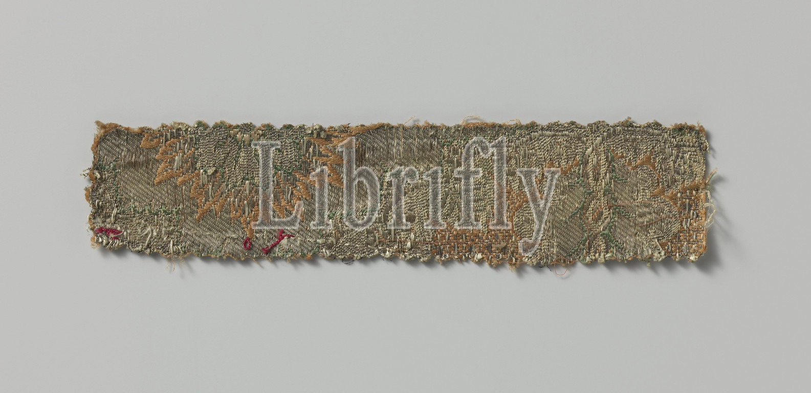 Fragment of multicolored brocatel, Five fragments of a silk fabric. Brown silk warp with wefts of silver thread and white, green, pink and red-brown silk. The drawing consists of large diamond-shaped medallions with leaf and fruit motifs. Note: Sides, put together small fragment, twill, satin, 1 cm wide. Different types and colors of silk., anonymous, 1775 - 1800, silk, linen (material), metal thread, brocatelle, h 4 cm × w 19 cm