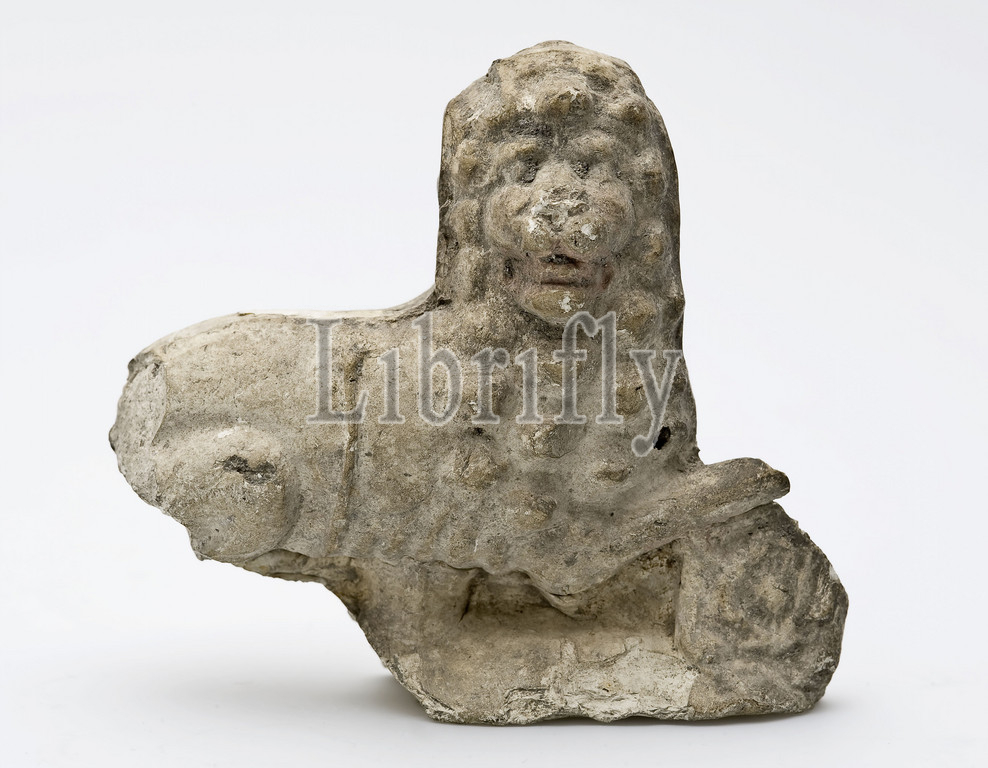 Fragment, polychrome pipe, lying, waking lion, sculpture footage, earth, discovery, pottery, earthenware, pipe, shaped baked, polychrome, sculpture, statue, waking, lion, Stylized stylized, mane, depicted, round spheres, mouth, red paint, remains, original coat, archeology indigenous, adornment, toys