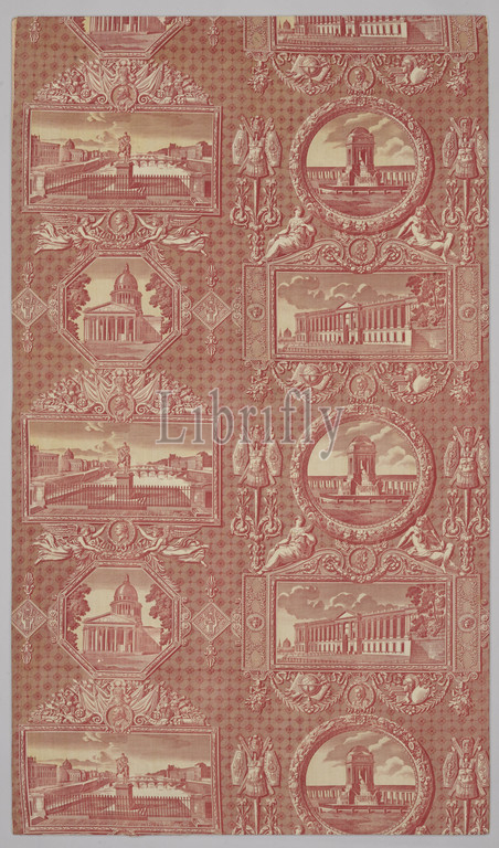 Fragment, printed cotton, décor, monuments de Paris, cotton, roll print, block print, colors red, yellow, purple, left, Pont Neuf alternates, equestrian statue, Henry IV, Panthé, right, Fontaine des Innocents, Perrault's east façade, Louvre, set, medallions, cartouches, Portraits, French kings Henry II, Louis XIV, Louis XVI, small medallions, performances, opaque white tin-lead-alkali glaze, decor, luster, people, cartouches surrounded, geometric motifs, two doors, ten drawers, brass knobs, doors, engraved hinges, drawer under, cabinet, valve, top, Handles, sides, furniture, Doors, drawer, lock, Manufacture Oberkampf, Jouy-en-Josas, 1818, textile, block printing, relief printing process, l 140