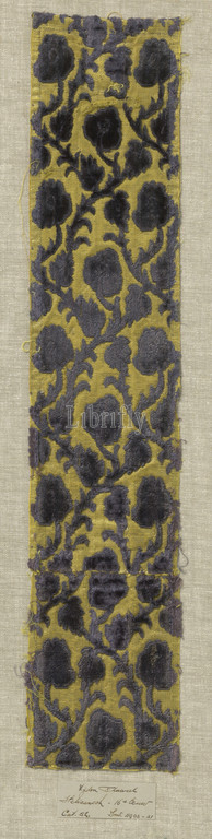 Fragment, silk velvet, branches, leaves, fragment, polychrome silk velvet, yellow sides, hard gold thread, ground interwoven, drawing, intertwined branches, purple, Italy, 1500, 1599, 1600, 1699, silk, velvet, fabric weave, ciselé velvet