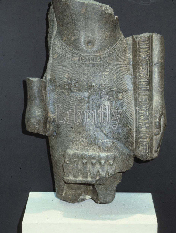 Fragmentary statue, Ramesses II, standard bearer, New Kingdom, Ramesside, Dynasty 19, ca, 1279–1213 B.C, Egypt, Granodiorite, H, 66 cm, 26, portion, temple II holds, staff, sacred standard, left hand, propping, side, shoulder