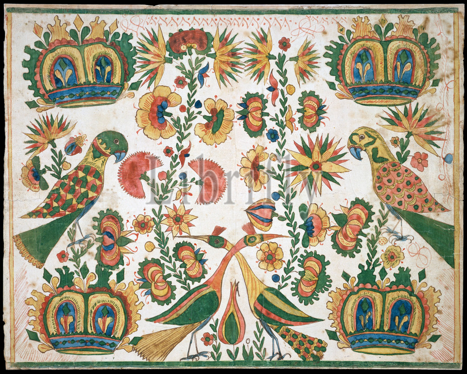 Fraktur, ca. 1770–1800, Made in Pennsylvania, United States, American, Watercolor, pen and iron gall ink, and graphite on off-white laid paper, 13 3/16 x 16 9/16 in. (33.5 x 42.1 cm), Drawings, Johann Heinrich Otto (ca. 1733–ca. 1800), By 1770, Otto, a German émigré, had begun to make various forms of fraktur, a style of decorative calligraphy named after a sixteenth-century German typeface. Otto’s skill is evident in the pleasing checks and balances of color and form he achieved in the composition of repetitive motifs